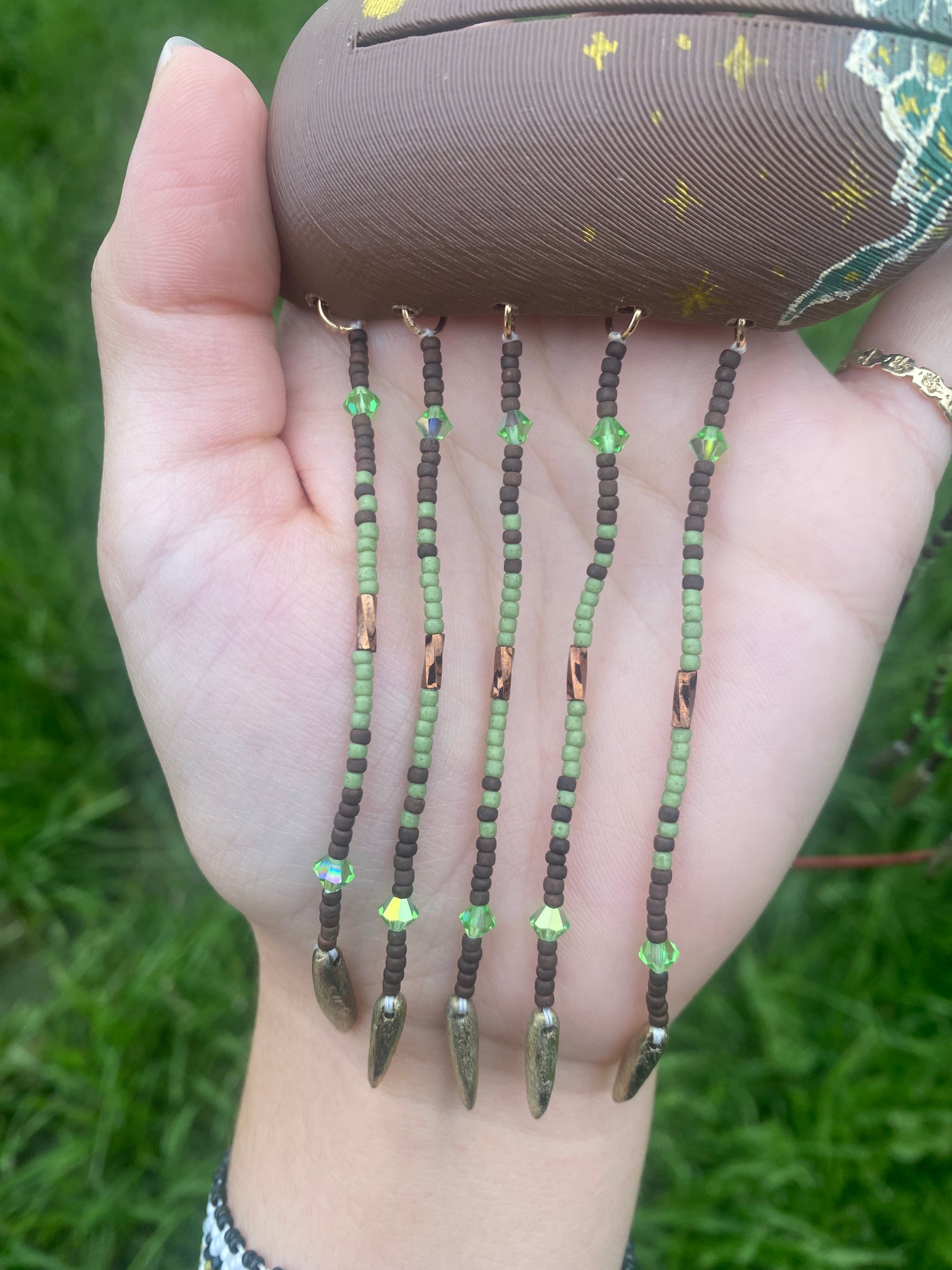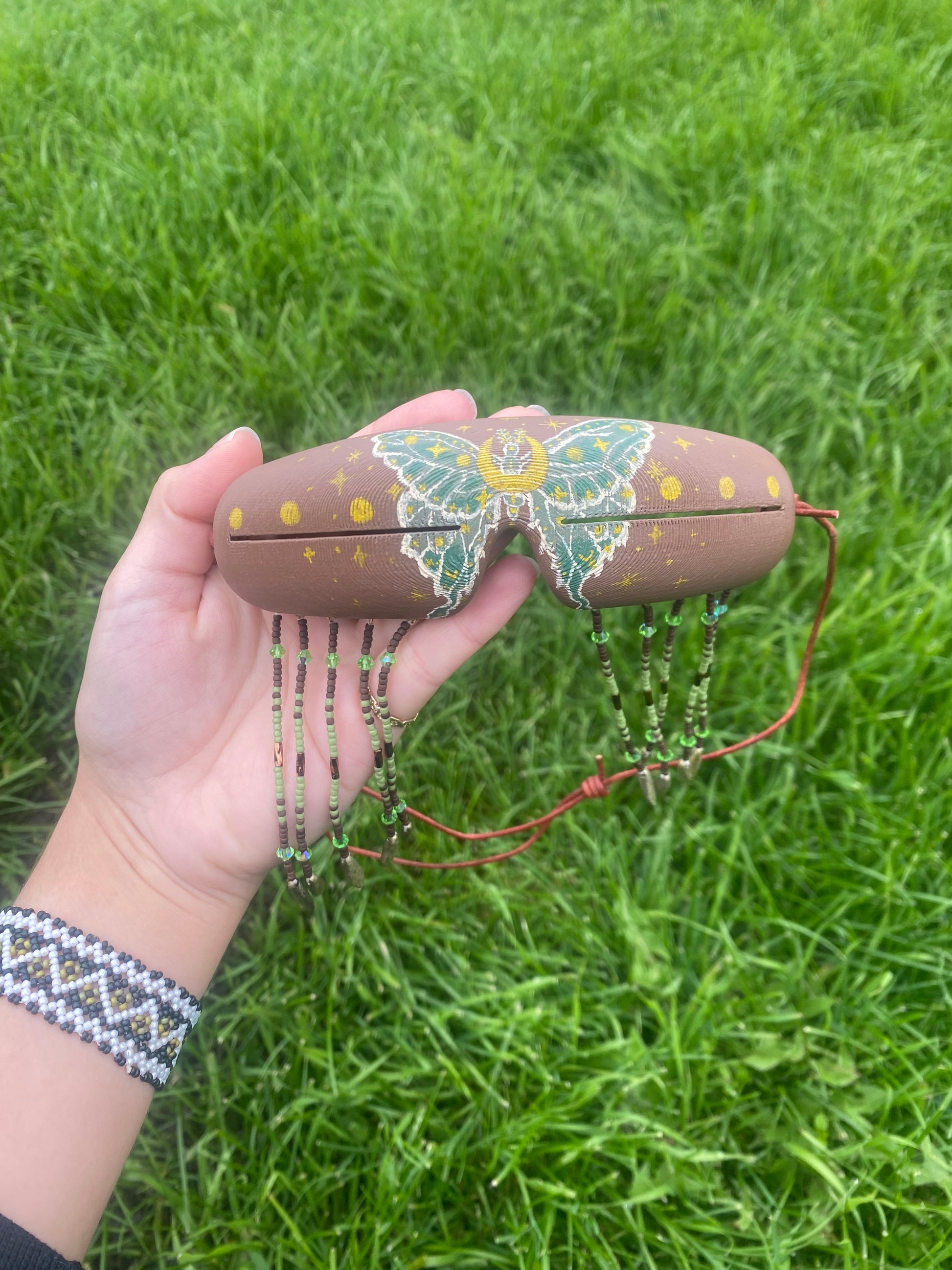 3D printed snow goggles with original painting of a luna moth and beadwork. Adjustable ties made with leather chord