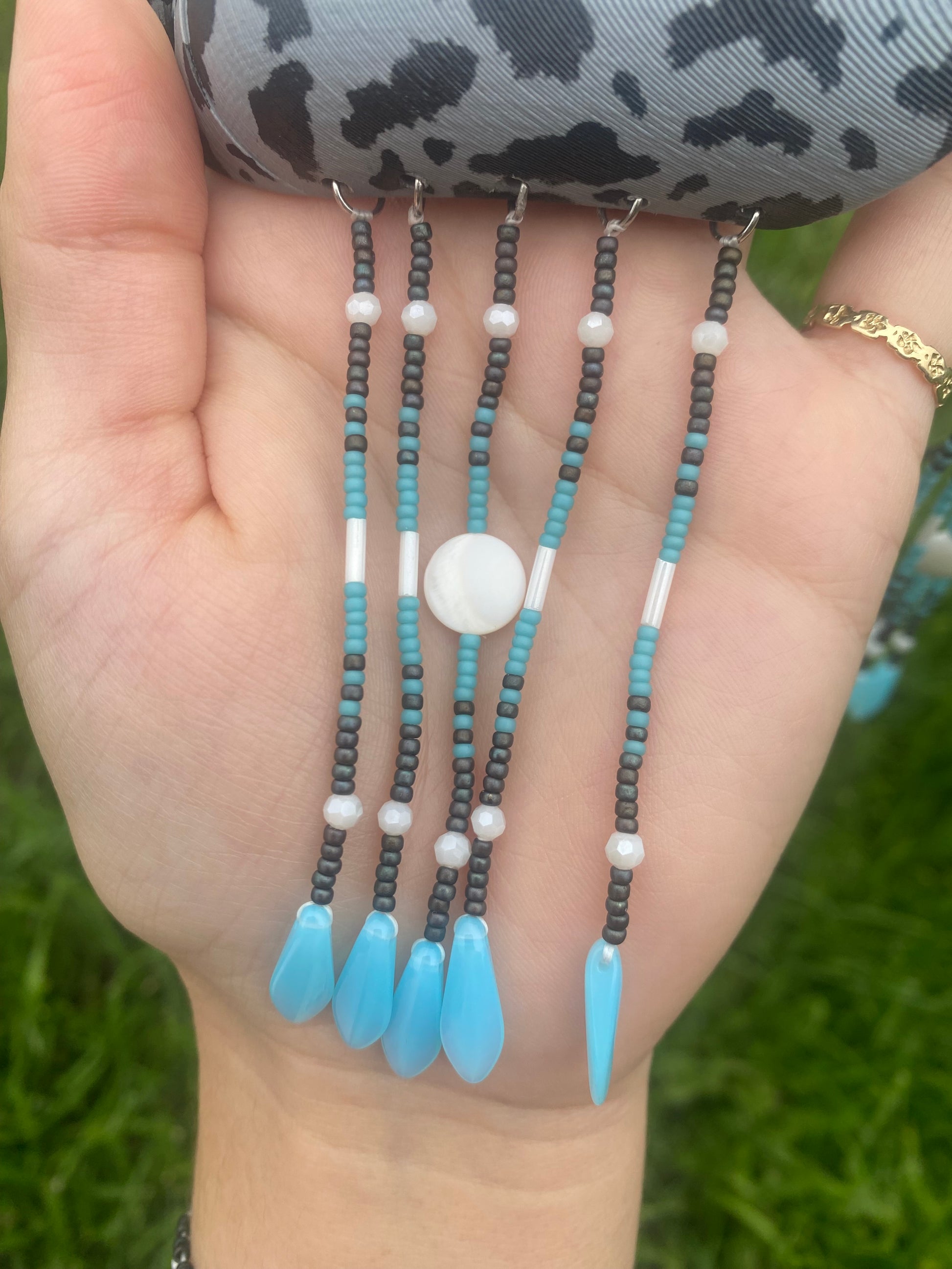 3D printed snow goggles with original painting of seal fur print and beadwork with mother of pearl accent beads. Adjustable ties made with leather chord